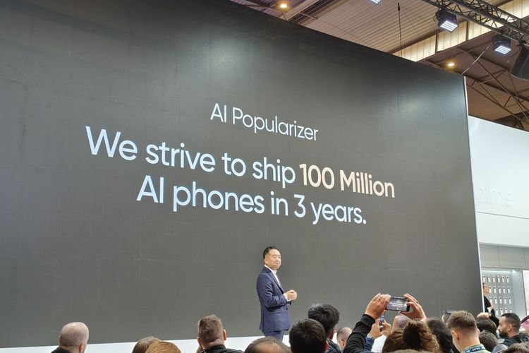 Kompas.com/BILL CLINTEN Head of Realme Europe,Jason Guo memaparkan strategi untuk mengirimkan 100 juta ponsel AI di tiga tahun ke depan di booth Realme di MWC 2025,Senin (3/3/2025).