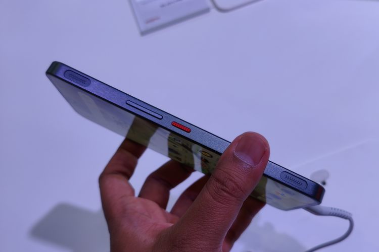 Kompas.com/BILL CLINTEN Bingkai kanan Nubia Neo 3 GT yang terdapat tombol trigger di atas dan bawah.