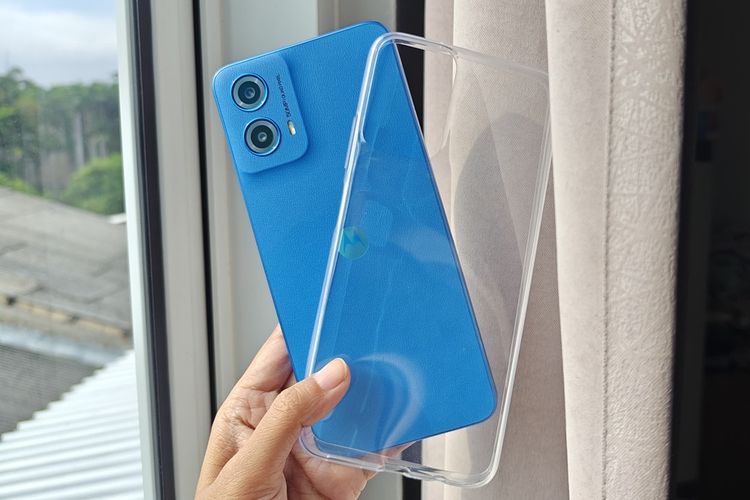 Kompas.com/Lely Maulida Seperti smartphone pada umumnya,Moto G45 5G dalam kotaknya ini sudah dipasangi dengan jelly case.