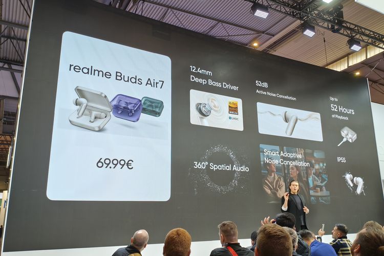 Kompas.com/BILL CLINTEN Realme Buds Air 7 meluncur di ajang MWC Barcelona 2025,dihadiri KompasTekno pada Senin (3/3/2025).Di samping Realme 14x,Realme juga meluncurkan aksesori audio wireless terbarunya yaitu Realme Buds Air 7.Produk true wireless stereo (TWS) ini dibekali dengan fitur peredam bising aktif (Active Noise Cancellation/ANC) yang bisa menghilangkan suara berisik hingga 52 desibel (dB).Untuk menghasilkan suara berkualitas,TWS ini dilengkapi audio driver besar berukuran sekitar 12,4 mm. Audio driver ini mendukung kualitas audio tinggi AAC,SCB,hingga LHDC 5.0.Pada aspek daya,masing-masing earbud TWS ini bisa dipakai mendengar musik hingga 13 jam dalam sekali pengisian. Jika habis,dayanya bisa diisi sekitar 10 menit untuk mendapatkan waktu pemutaran musik