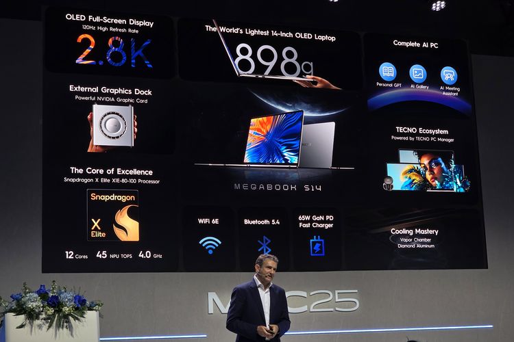 "Kami telah membuat laptop OLED 14 ini yang paling ringan di dunia. Inilah MegaBook S14. Walau ringan,laptop ini tetapmemberikan performa yang luar biasa,berkat prosesor Snapdragon X Elite," kata Oliver Mas,Global Product Launch Officer Tecno di panggung peluncuran.
